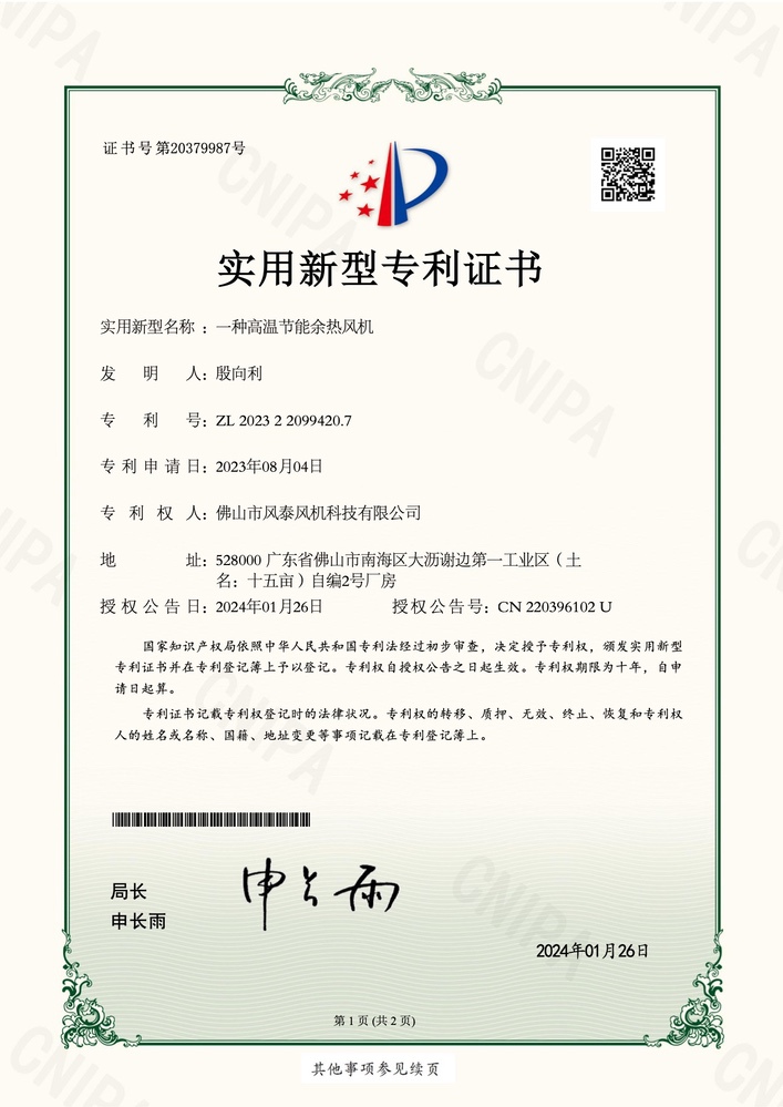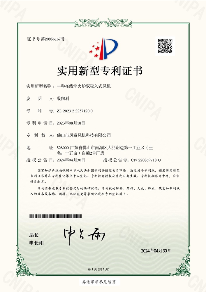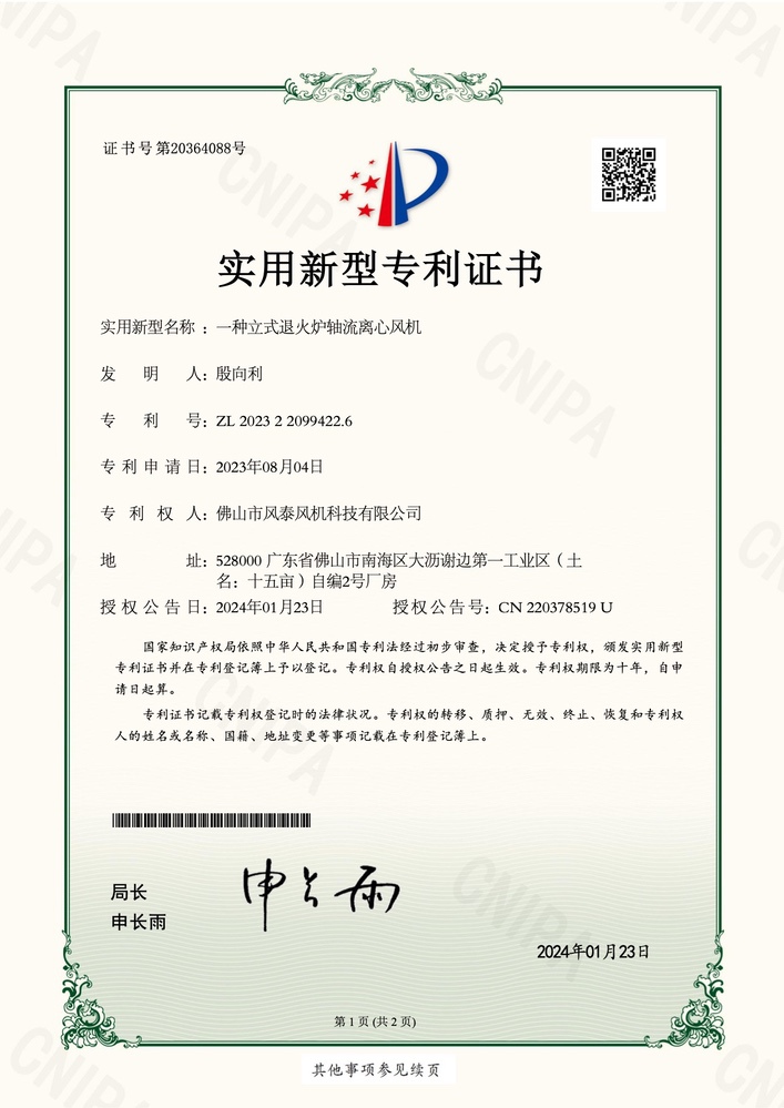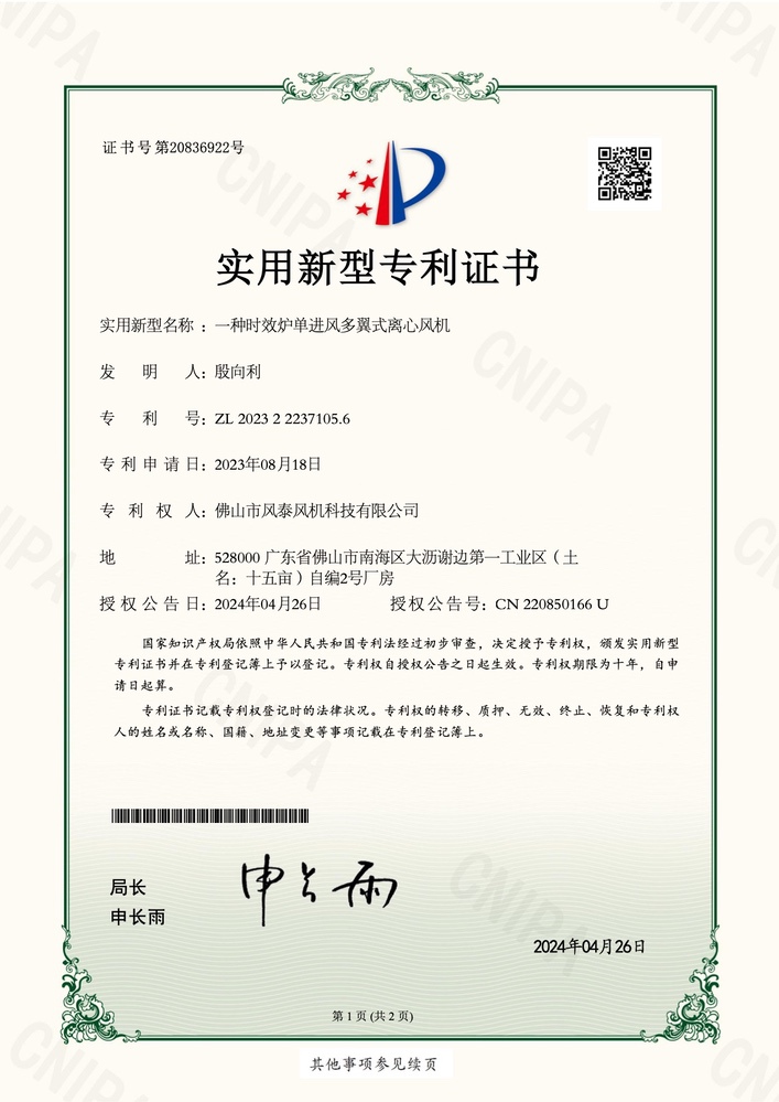 一種鋁材熔鑄爐節(jié)能風機-專利證書